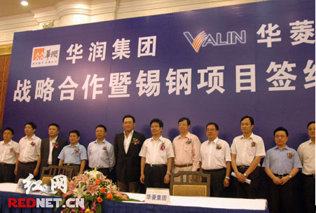 紅網(wǎng)長沙8月9日訊( 記者 劉怡斌 實習(xí)生 戴微佳 鄧威美 )今天中午,湖南華菱鋼鐵集團與華潤集團有限公司在長沙舉行戰(zhàn)略合作暨錫鋼項目簽約儀式。華菱集團將增資6.5億元持有錫鋼集團55%的股權(quán),華潤集團繼續(xù)保留其在錫鋼集團45%的股權(quán)。湖南省委書記、省人大常委會主任張春賢等領(lǐng)導(dǎo)見證了這一盛舉。
